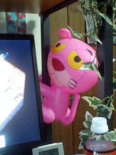 車につけようと思ったけど、ピンクパンサーが上手く捕まってくれるところが見つからなかったのでパソコンデスクにつかませることにしました。